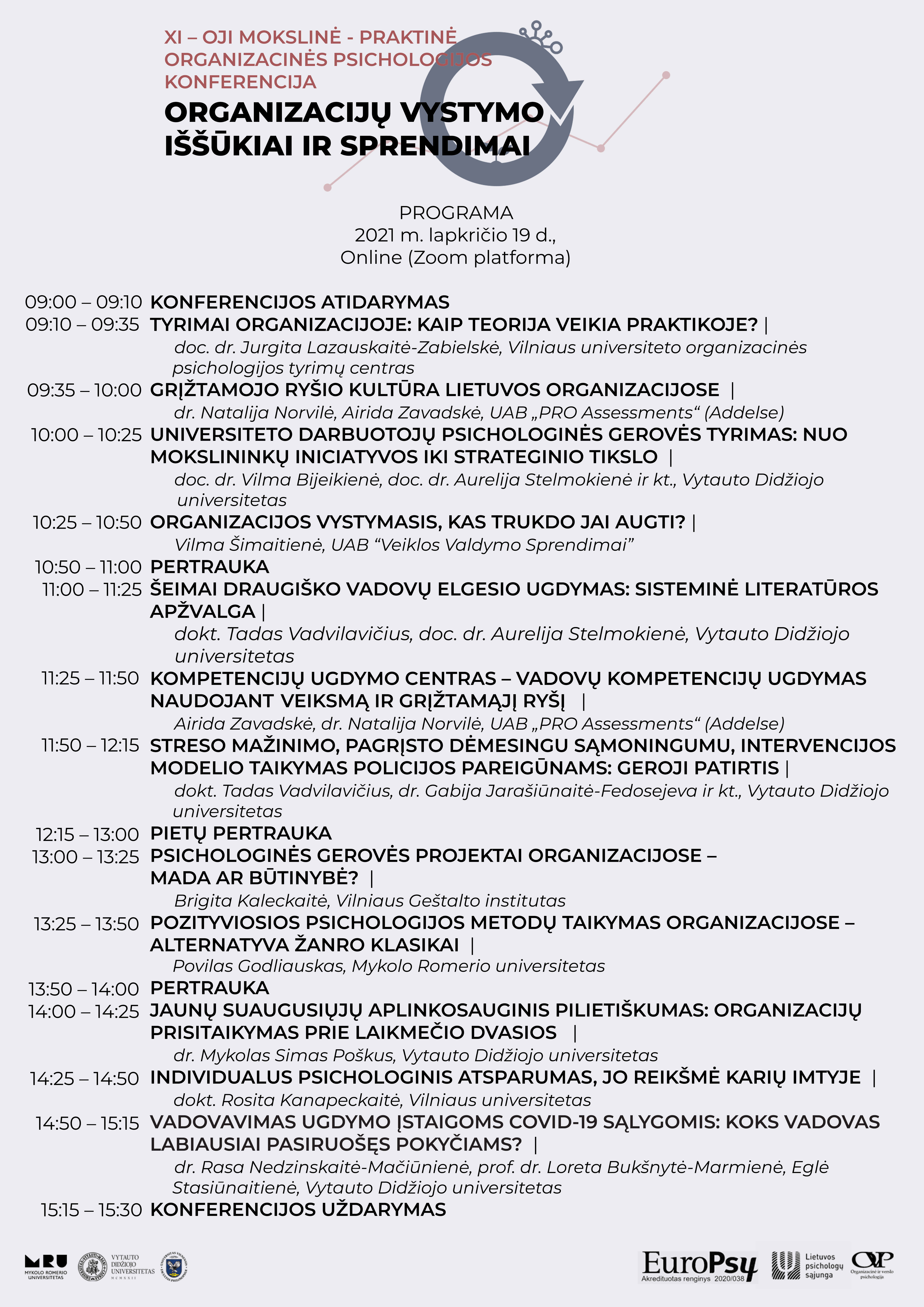 Skelbiama 2021-11-19 d. vyksiančios XI-osios mokslinės praktinės organizacinės psichologijos konferencijos programa.