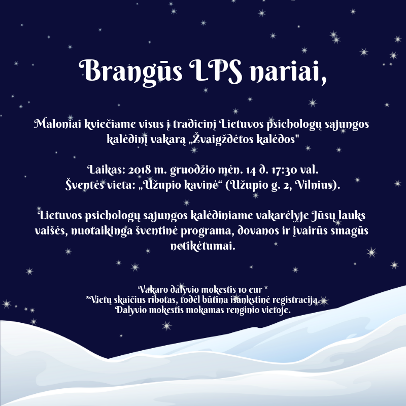 Maloniai kviečiame visus LPS narius į tradicinį Lietuvos psichologų sąjungos kalėdinį vakarą, kuris šiemet vadinasi „Žvaigždėtos Kalėdos“. Daugiau informacijos ...