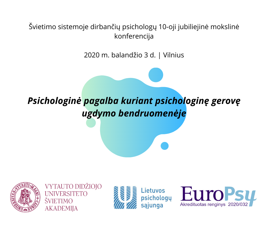 Maloniai pranešame, kad 2020 m. balandžio 03 d. Vilniuje, VDU Švietimo Akademijoje, vyks 10-oji Jubiliejinė kasmetinė švietimo sistemoje dirbančių psichologų mokslinė konferencija: „Psichologinė pagalba kuriant psichologinę gerovę ugdymo bendruomenėje“. Dalyviams išduodami LPS renginio pažymėjimai.