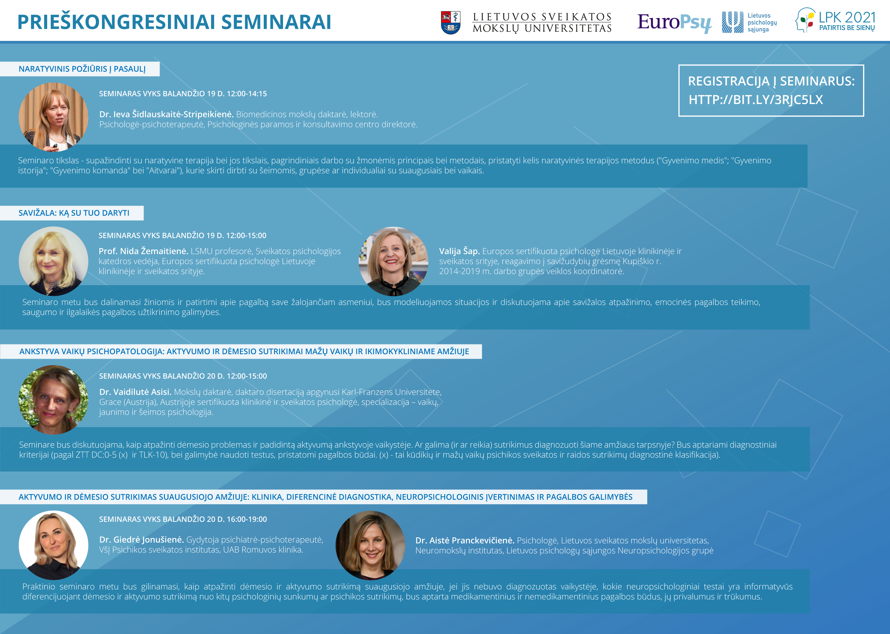Į prieškongresinius seminarus reikalinga išankstinė registracija! Nedalyvaujantiems LPK 2021, vieno prieškongresinio