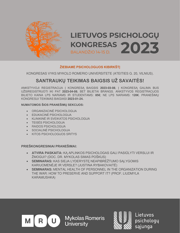 Kviečiame teikti pranešimų santraukas Lietuvos psichologų kongresui - 2023, kuris vyks 2023 m. balandžio 14-15 d., Mykolo Romerio Universitete.