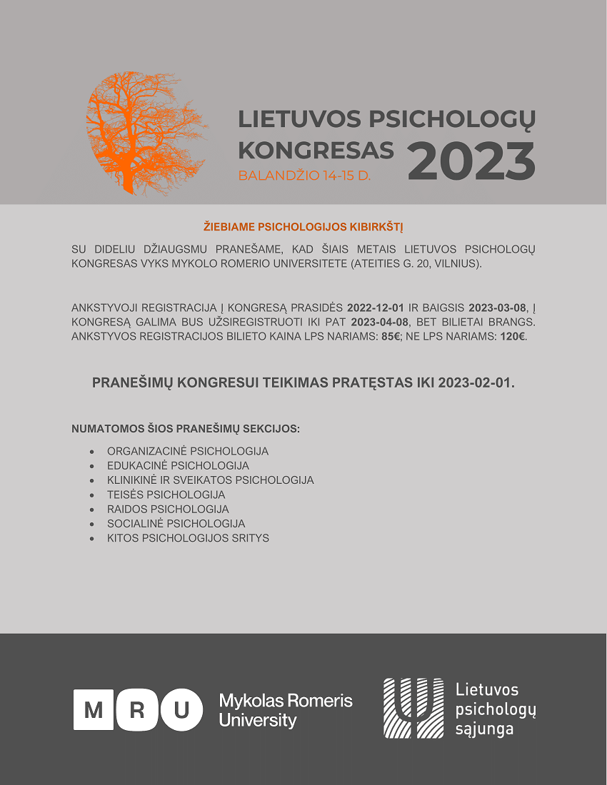 Lietuvos psichologų kongresas - 2023 vyks balandžio 14, 15 d. Mykolo Romerio Universitete.