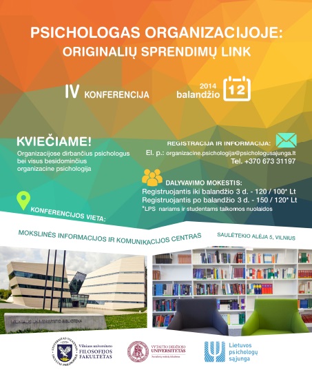 Jau galite susipažinti su kasmetinės organizacinės psichologijos konferencijos "Psichologas organizacijoje: originalių sprendimų link" (balandžio 12 d., Vilnius) PROGRAMA. Labai kviečiame registruotis ir dalyvauti!